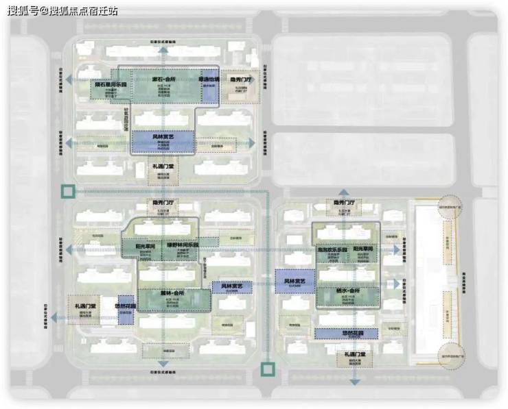 整体的社区营造上采用江南园林设计手法,提取“环秀山庄”“艺圃”、“网师园”的经典元素。通过“回”字型分布形成“一带、三心、五轴、多组团”的整体景观布局。