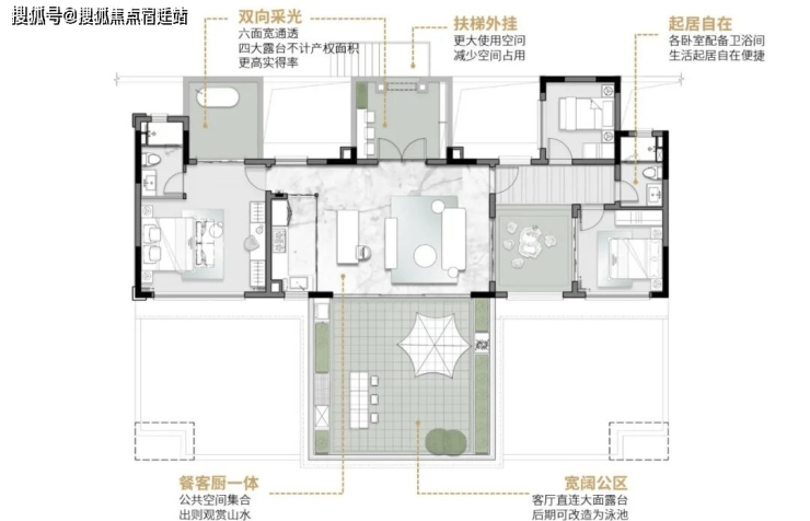 试着向山湖推开一扇窗,赠送面积约80㎡,客厅直连约6.6米超大景观露台,后期可改造为泳池,四大露台实得实享。四个露台可充分匹配全家喜好,烧烤、品茶、看书、玩乐,甚至约上好友在泳池中与山湖共举一杯……使得人们不论在卧室或是在厨房,都能享受到清晨的第一缕阳光和窗外的湖与山。