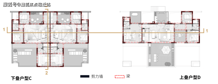 结构上,建筑设计师与结构设计师密切协作,研究客餐厅的无梁处理。最终,将客餐厅部分通过结构转换取消常规梁系布置,客餐厅大通厅无梁处理,可增加客户后期使用改造可能性,增加产品溢价;二层柱子通过结构转换,实现客餐厅大通厅顶部无梁处理,确保使用空间的完整性。
