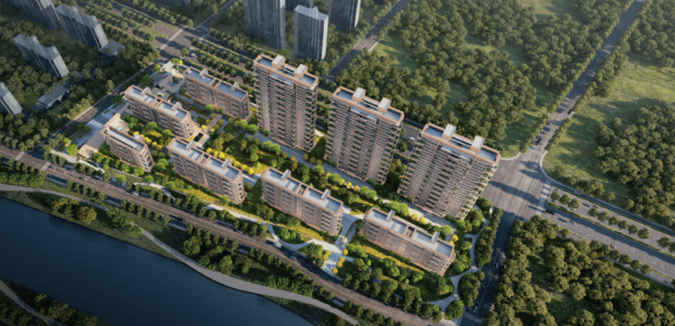 七里江澜府引七里河风光入园,构建起“一带、一环、一轴”的云台森境,这也是项目名称的由来。