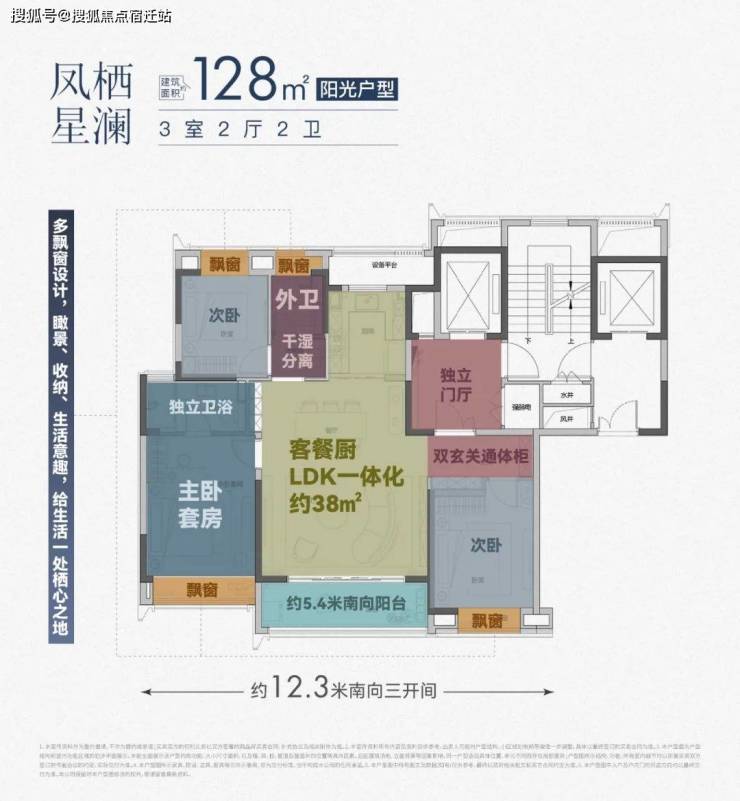 建筑面积约128㎡三室两厅两卫——宽厅设计,南向面宽约12.3米,约5.4米阔绰光合阳台,约38㎡LDK一体化餐客厨,每一处皆印证超强品质与收纳空间超时代的产品营造能力。