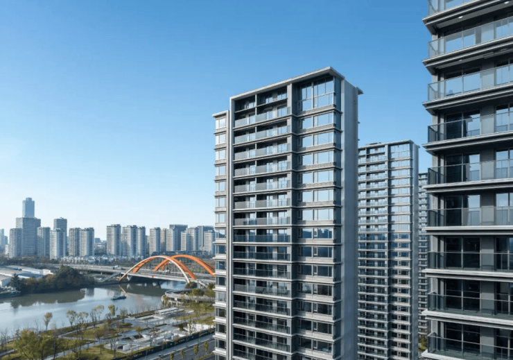 一共14幢高层建筑,轻盈地伫立在京杭大运河旁。一个个阳台横铺开,超大的窗墙比,大面积的玻璃清澈如镜,高级灰的外立面在阳光下熠熠生辉。