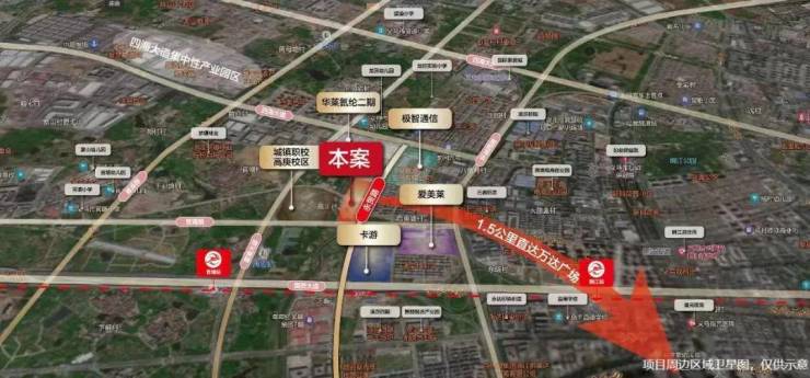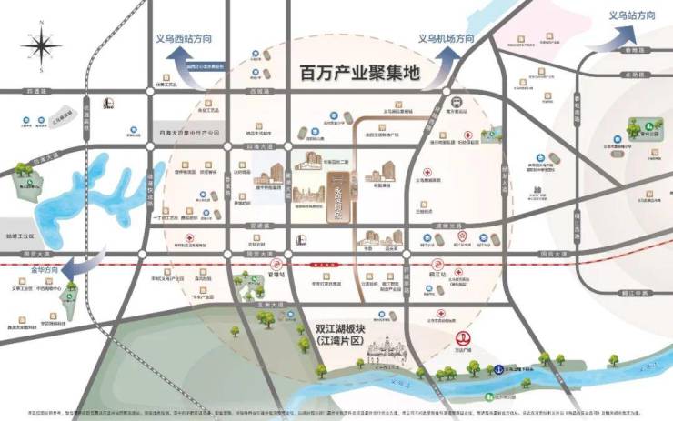 项目位于稠江街道核心发展区,金义都市圈主轴,列入《义乌国土空间规划》「主城区 -双江湖副城」发展轴,享土地/税收双重政策倾斜。这里属于义乌规模企业最密集区域,毗邻产投93万高新产业园,四海大道工业区和多个产业园环绕,超百家企业集聚,爱美莱、卡游(总投资10亿元/2026年一季度投产)等园区遍布周边。产业高地,虹吸人才,人气流量高地。