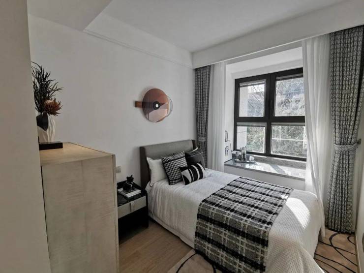 U型厨房,操作台与厨房动线符合人体工学设计,转身之间,洗、切、烹、炒流畅便捷,与餐客厅形成一条笔直的居家生活动线;三间卧室全附带飘窗,拓宽了景观视野的同时,增加了实际空间使用率;南向主卧做了带独立卫生间的套房设计,仪式感和私密性更强。