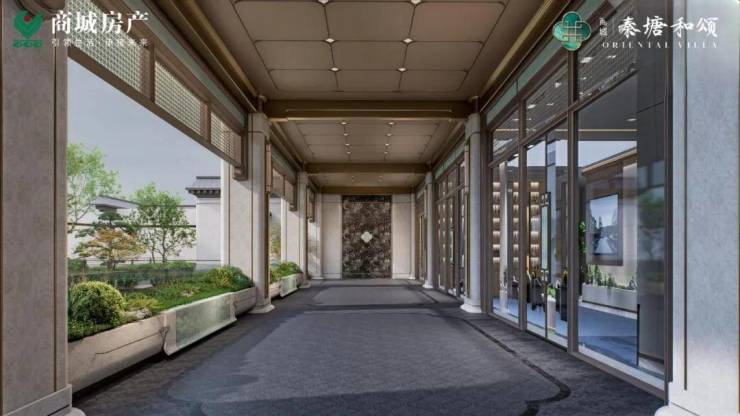 秦塘和颂会所内部以珍贵奢石勾勒尊崇质感:主入口萃选东方白奢石,两侧照壁铺陈大面白雪公主奢石,一层廊下空间黑金花奢石