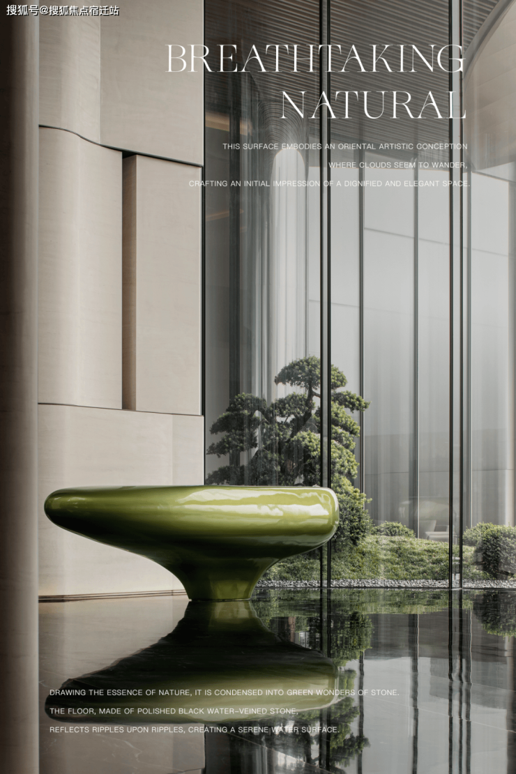 汲取自然之精华,凝结为绿色奇石,地面采用磨黑水文石材倒影出层层涟漪,取意悠然水面,云游其间的东方诗境,构筑端庄优雅空间首印象。
