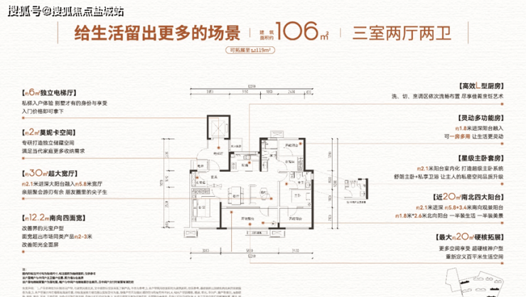 阳台飘窗等赠送可达约10㎡,两房轻松变三室,空间灵活性更高。