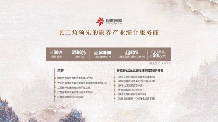 金陵玖园·玠园的背后,是银城国际、银城物业和银城康养三大品牌的鼎力支持。银城国际作为港股上市企业,一直致力于打造全龄品质物业;银城物业作为南京乃至江苏省首屈一指的物业管理服务供应商之一,为长者们提供了高品质的物业服务;银城康养则是一家专业的养老运营企业,为长者们提供了全方位的颐养服务。这些品牌的强强联合,为金陵玖园·玠园的品质和服务提供了坚实的保障。