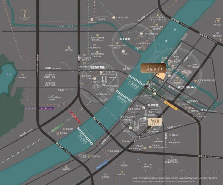 ◎国际会客中心:奥体中心、博物馆(规划)、美术馆(规划)、图书馆(规划)、国际青年交流中心(规划)、水云间时尚文化街区(在建)、奥体中心主体育场、杭州国际博览中心、奥体中心游泳馆等