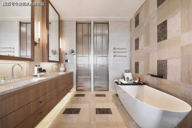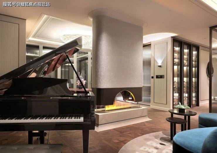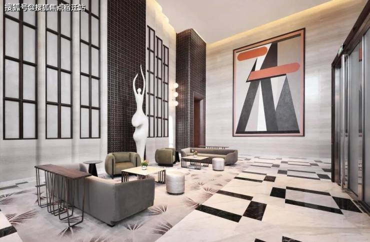 进入9.9m高的大堂,就开始呈现出完全有别于其他大平层的独特审美,墙面上运用了很多木格元素,地面是鱼肚金、金镶玉、宝格绿和伯爵白四色奢石拼花,巴黎舞者的雕塑与广州瑰丽酒店的那款著名的雕塑平衡有着巧妙的呼应,在动静之间传递着轻盈惬意的归家氛围。
