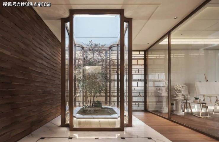 电梯厅的设计也极其惊艳,像是美术馆,乘电梯上去,推开1.8m的子母门,映入眼帘的竟然是一个内天井,四面的钢化玻璃,鱼肚金砌筑的地台上种着一棵鸡爪槭,清晨的丁达尔光像牛奶浴一样洒下来,一下子有了呼吸感。