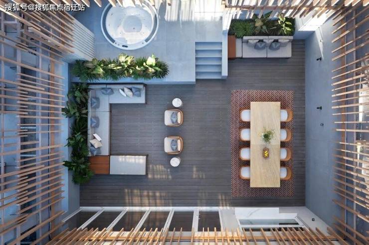 这套房子最大的亮点,是约80m²的超大露台,天空四周做了木纹架构,跟K11商场里的艺术吊顶一脉相承,形成了极好的空间包裹感,不禁让人想起广州瑰郦酒店460米高空的户外餐吧,一丛丛小绿植包裹出的卡座,夜幕降临,低头是红酒杯摇荡的烛光,抬头是小蛮腰闪耀的珠光。