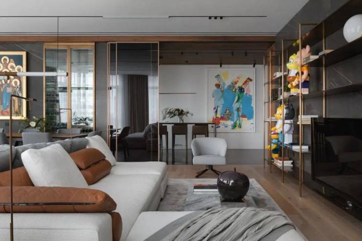 由设计师Artur Sharf,Artem Zverev,Alesia Riamova,Anya Tarabanova,Gleb Brizhanov共同设计,客厅以灰白色为主,与金属材质搭配,加入工业风元素,使得格调满满的,纯粹而惊艳。