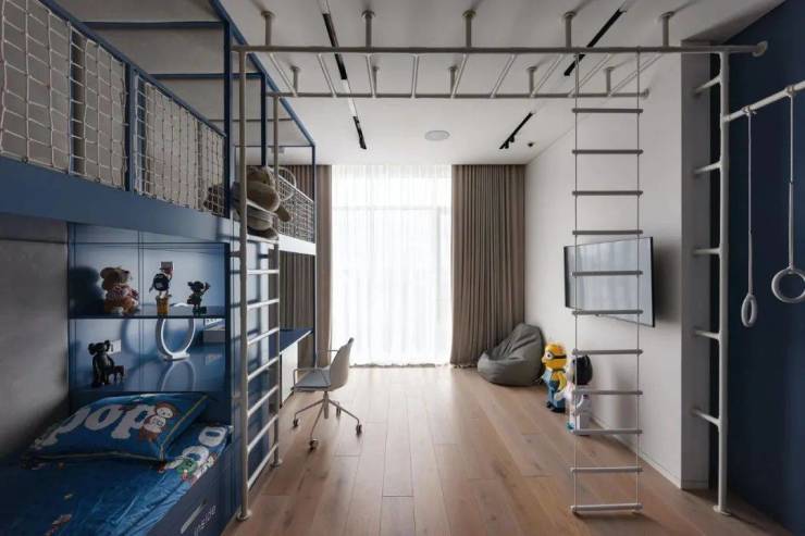 男孩房在主色调的基础上增添了蓝色用以装饰,用色彩传递情感,各种运动器材满足男孩的好动天性。