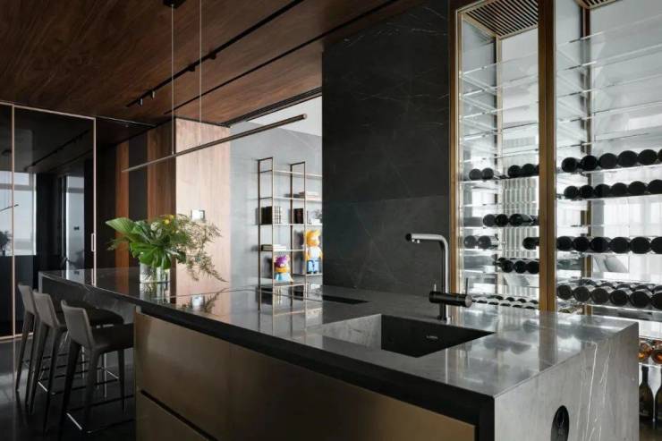 大大的空间,视觉感强烈,移动的玻璃门把客厅和厨房餐厅隔开,中央岛台和餐厅一体,线条简单,原木色天花和光线烘托出强烈的戏剧感。