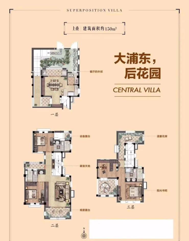 上叠户型是建筑面积150平米的三层,4房2厅中西双厨的全套房设计,特设独立花园入户通道,保障业主私密性。