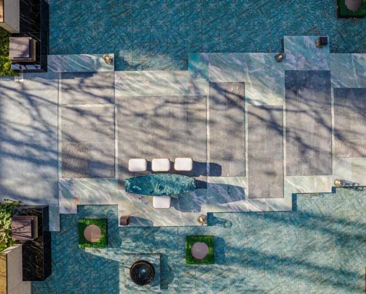 建筑基座部分采用白玫瑰奢石,石材的稳重感,搭配淡灰色系,呈现出呼吸感、浑然天成,松弛感,宝格丽绿等细节工艺溯源半岛酒店似曾相识。