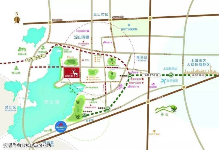 两地政府在推介会中提出一体化发展首先要实现交通的互联互通,重点提出规划轨交S3号线连接上海17号线漕盈路站,s3号线是苏州政府响应国家发展旅游业而打造的一条旅游专线,从苏州出发,环绕5大古镇(同里 周庄 锦溪 淀山湖 朱家角),并且打通新乐路与崧泽大道的断头路,从地铁和公路两方面将青浦和淀山湖融为一体,目前新乐路的断头路已经打通,后期往西延伸的松泽高架于2019年底完工,这条高架建成从我们项目到虹桥只有28公里30分钟车程。曙光路与上海的复兴路也将缩短淀山湖与上海青浦的距离(工期500天,预计2020年底通车)。上海轨道交通17号线(2号线延伸段)已于2017年年底正式通车,使我们板块快速融入大上海都市圈。项目距离最近的17号线漕盈路站,距离约7公里,17号线可以换乘上海地铁2号线,可以快速到达上海市区,轨交17号线无疑成为淀山湖新城承接东侧大虹桥区域的辐射、打通整合湖滨资源的潜能,扮演着重要角色。