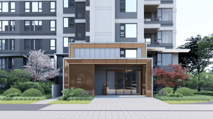 项目在单元入户门厅采用石材幕墙门头设计,尽显高级感与品质感。