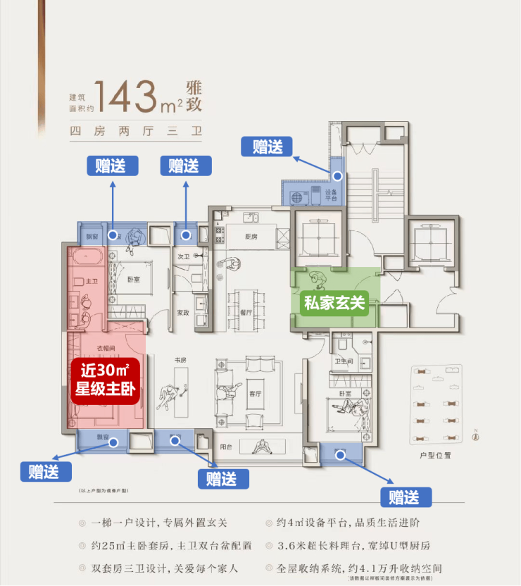 143㎡飘窗赠送面积为7.83㎡,主卧面积24㎡+飘窗2.88㎡,整个主卧面积可达26.88㎡;