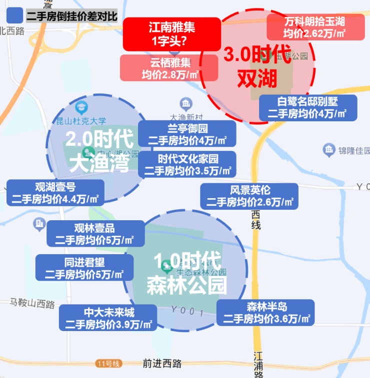 从图中数据可以清晰看出,与城西老核心二手房相比,双湖的新房价格有着极大优势,最大价差近2.5万/㎡,竟然高达一倍之多。