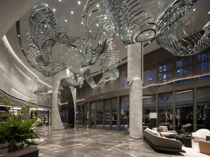 沿袭三叶草建筑的流线感,华鸿都会中心营造游艇式空间主题,黑白灰大理石的底色,局部以棕色和金属铜色擦亮,与上空悬浮的“潮汐”装置和船形雕塑相呼应,精琢堪比五星级酒店的精装入户大堂,提供了精神需求的秩序享受。