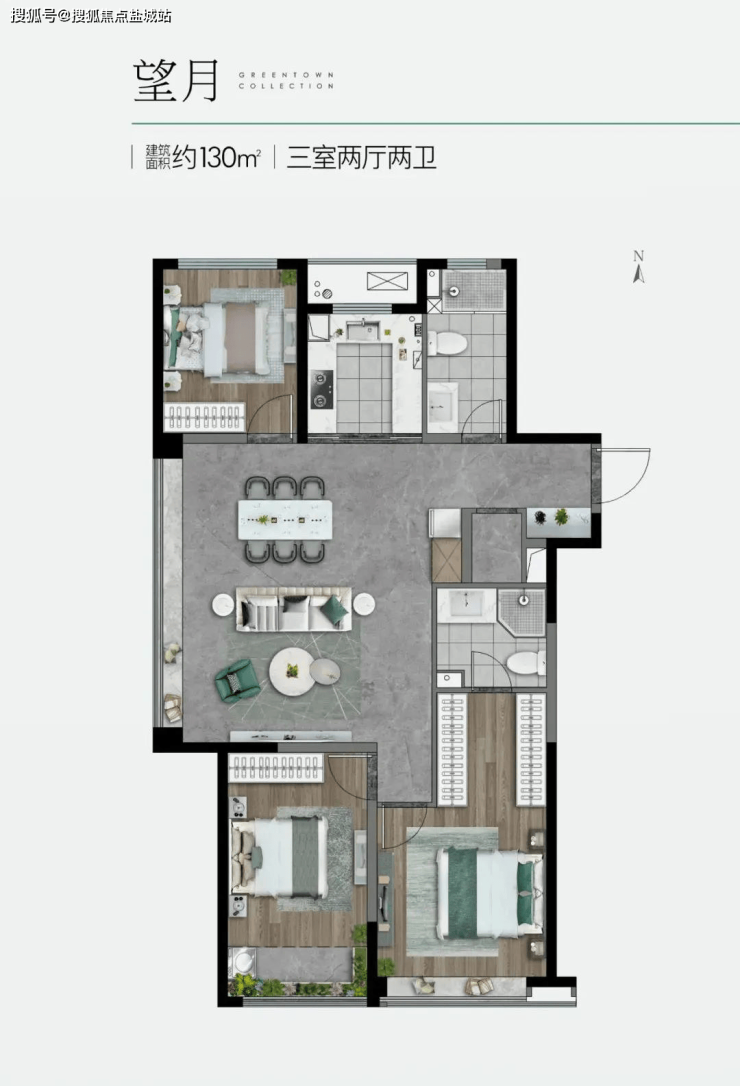 130㎡的三室两厅两卫是东西户,餐客厅一体带飘窗,夏季西晒不可避免,次户型不同于常见格局,空间利用较为浪费,并且主卧卫生间是暗卫。可以去项目实地感受