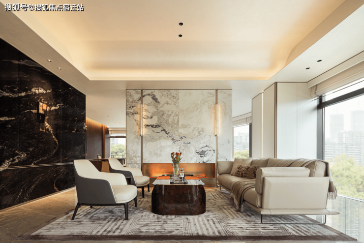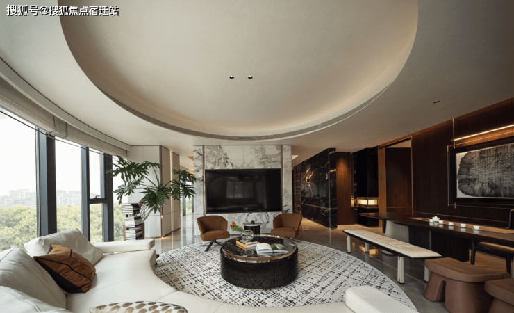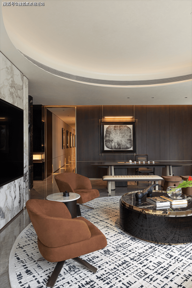 会客区以圆润的吊顶衬托开阔的视野,漫射的光线从弧形边缘倾泻而下,温柔,亲昵。大理石与木饰面的搭配将现代质感与沉稳气息融为一体,中央圆桌与沙发围合出一个交流的温暖场域。