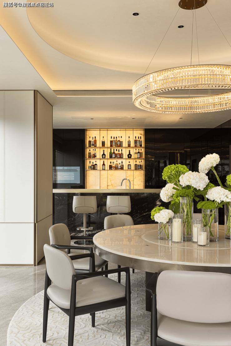 餐客厅被巧妙地划分为两大区域。修长的西餐餐桌沿空间中轴延展,通透的吊灯和天然石材背景,呈现出现代的冷静与和谐。