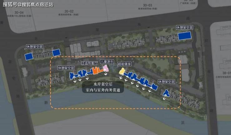 项目南向临河,为了更好发挥水岸优势,沿河设7户架空层,把河景最大程度引入社区,达到了室内与室外视线的贯通。