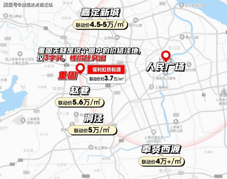 打开地图,若以市中心为圆心,赵巷与重固离市中心距离相当,联动价已达5.6万/㎡,嘉定新城4.5-5万/㎡,奉贤西渡也已4万+/㎡。