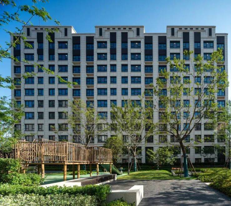 在南侧主入口的尽头,一座巍峨的迎宾景墙矗立,其背景色采用了与建筑风格完美融合的厚铜色,彰显出庄重而典雅的格调。景墙前,一处精致的中国黑石材水景巧妙布局,简约而不失雅致,为社区营造出一片宁静而优雅的氛围。水景的流动之美,如同生命的脉搏,为这片空间注入了活力与生机。