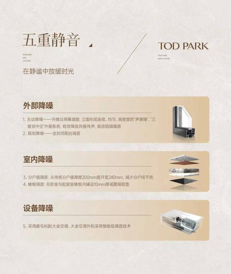 ▶五重静音,三玻二腔外窗系统、设备主机房设置架空车库层及以下、分户墙提升至240mm、铺设10mm减震隔音带、大金空调