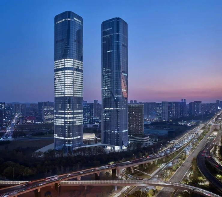 杭州世茂智慧之门项目总建筑面积达370,000平方米,共由5栋建筑组成,涵盖办公、公寓、商业及城市公园等多业态功能。其中,A、B两座超高层办公塔楼是综合体的核心;C、D、E附楼作为居住、商业及社区服务配套,扩展空间以配合完善项目的整体运营。