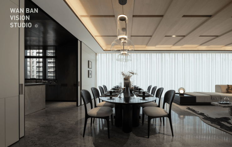 大量的深色系木材运用,搭配大面积的大理石,透露着一种古朴又时尚的质感,这是吴滨想要的「摩登东方」意境。入门第一眼你会注意到一个背景墙充满禅意的茶室,它可以是独处的空间,而把屏风一样的木质移门打开,它又成为了餐客厅一体化公区的组成部分。