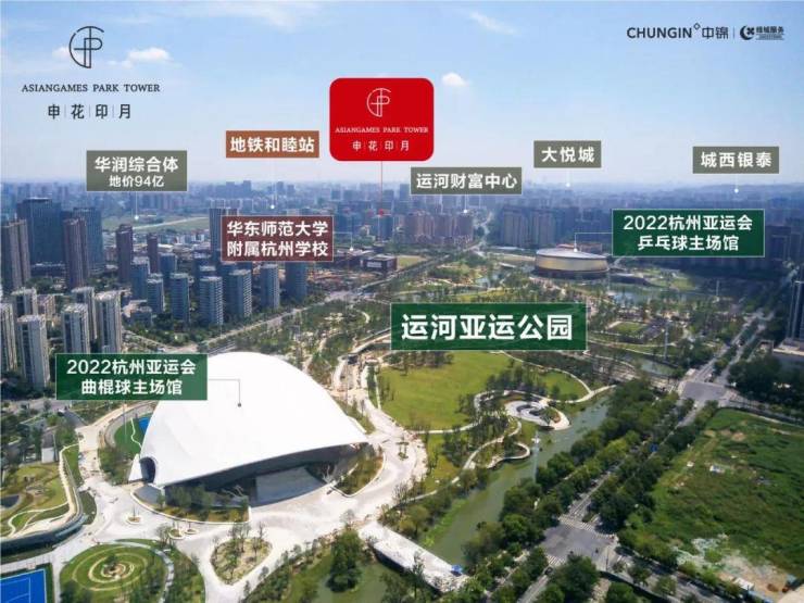 🛥申花印月地块中央为婴儿港河,项目五幢极简“四棱镜”建筑沿天然河道座落,玻璃幕墙配铝板结构,呈现当代雕塑美感,亚运公园旁的时代美学地标。