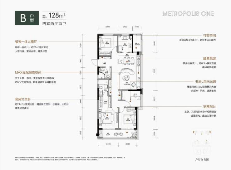 约128平方米的户型提供了宽敞舒适的居住体验。其四房边套设计不仅优雅且实用,餐客厅一体化布局配合飘窗,不只拓宽了视野,还为家庭聚会创造了理想空间。在此,无论是家庭成员间的互动还是与朋友的欢聚,都格外温馨和谐。
