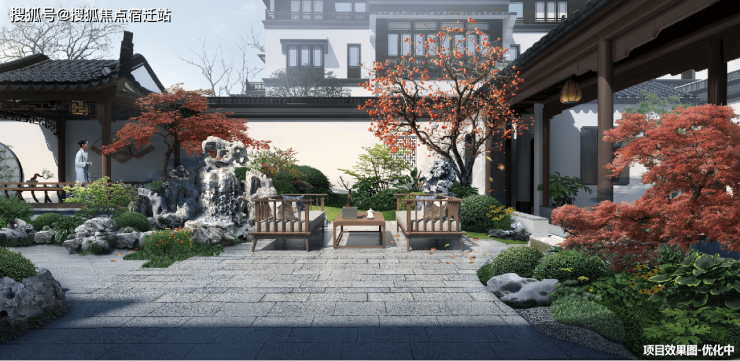 将军门、披檐门、歇山顶、花窗、瓦当、寻杖栏杆等经典中式建筑部件,在此创新演绎,再现中式古韵。