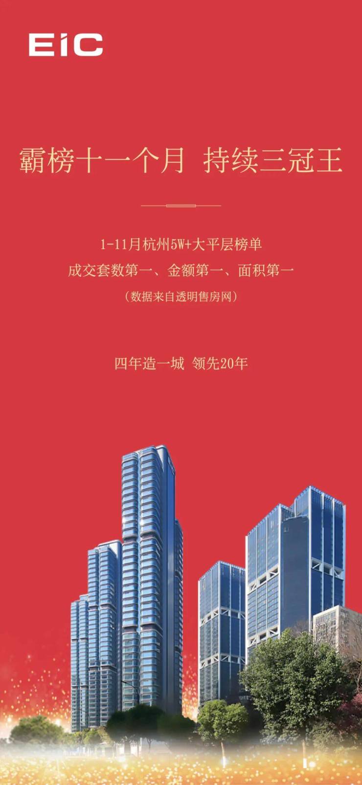 据统计,1-11月EIC顶豪大平层持续霸榜杭州5W+大平层成交套数、金额、面积三冠王,超甲级写字楼齐头并进,累计11个月的网签销量,摘得杭州写字楼销冠!