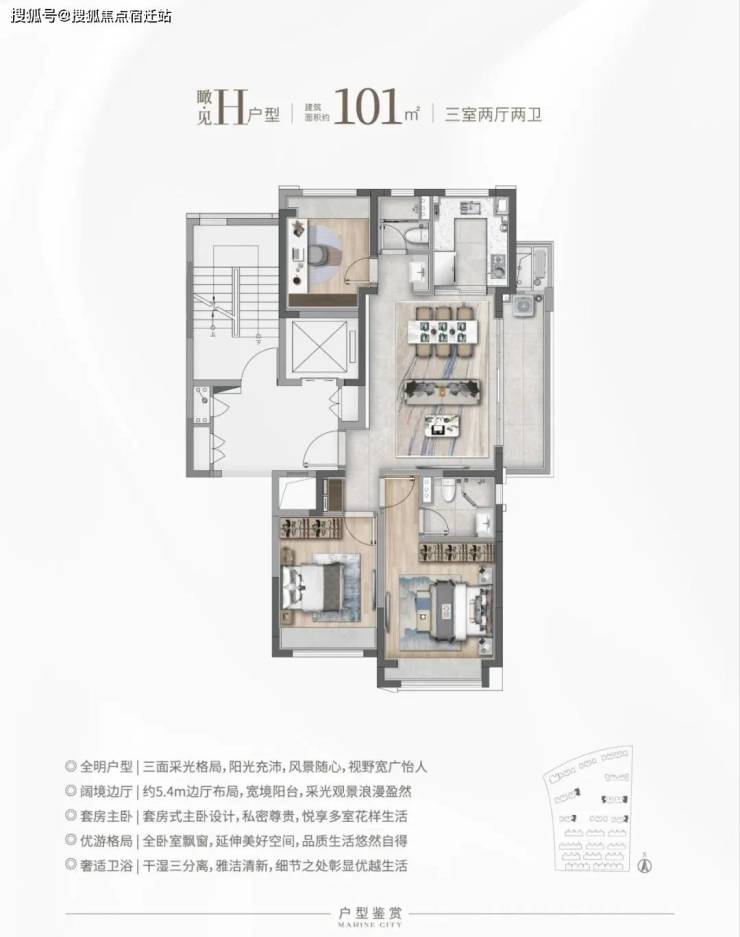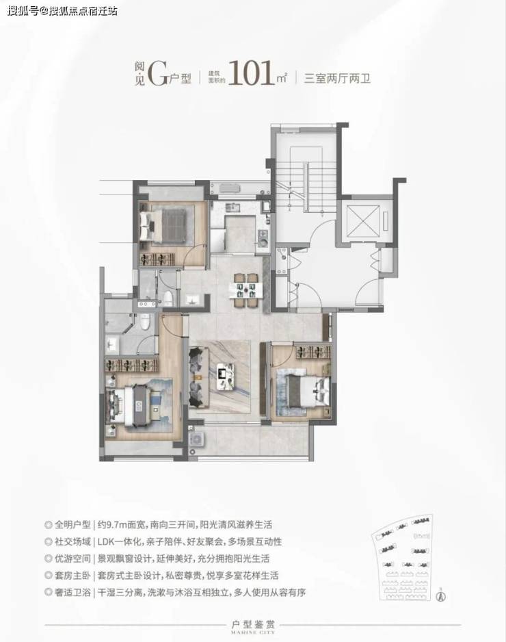 - **高层101㎡经典三房**:南北通透+三开间朝南,客餐厨一体化+IMAX级观景阳台,主卧套房设计,新风地暖空调三大件全配,精装交付即享品质;