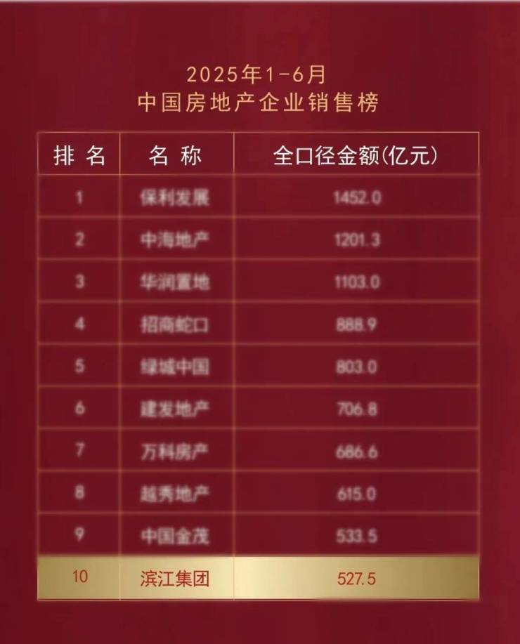 ✦ 滨江集团荣誉:千亿级领军民营房企,2025年上半年中国房地产企业百强TOP10,民营企业TOP1。(数据来源:克尔瑞)