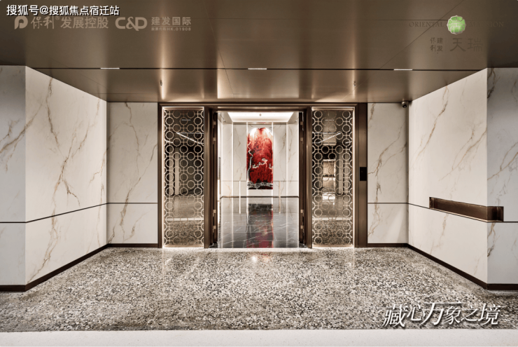 入户大堂的 大理石幕墙,是匠人根据石材原生纹理走向进行对纹排版的,耗时2个月才完成;