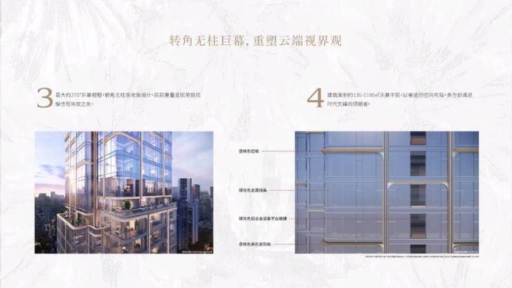 2、最大约270°转角无柱巨幕视野,全玻璃幕墙系统,畅享稀缺城市景观资源。
