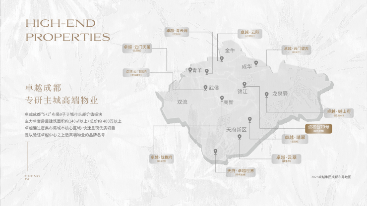 入蓉六载,布局成都"5+2"核心城区,选址均在城市头部价值板块,主力单套房屋建筑面积约140㎡以上,总价约400万以上。卓越通过密集布局城市核心区域,快速呈现优质项目,足以验证卓越中心之上造高端物业的品牌名号。