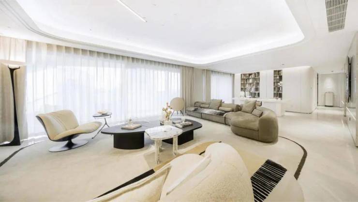 约440㎡“香奈儿”西边套,浅淡得宜的洁白,温润如玉的蜜色,将空间衬得时髦优雅。
