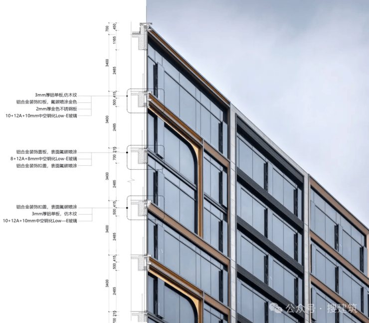 运用勾线、转角、切割、包圈等难度异乎寻常的工艺,加上大面积流云灰玻和极高的窗墙比,看起来舒适、时尚、大气和饱满。
