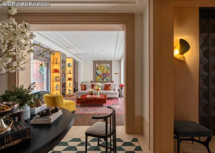 入户空间由一个简约的门厅和楼梯厅组成,门厅配有控制台和嵌入式衣柜。以多功能圆桌为中心的楼梯厅连接着楼梯、电梯、客用卫生间和客厅。空间采用白色洞石搭配特制染色的胡桃木,其浅色调与洞石和谐呼应,同时保留了胡桃木独特的纹理特征。