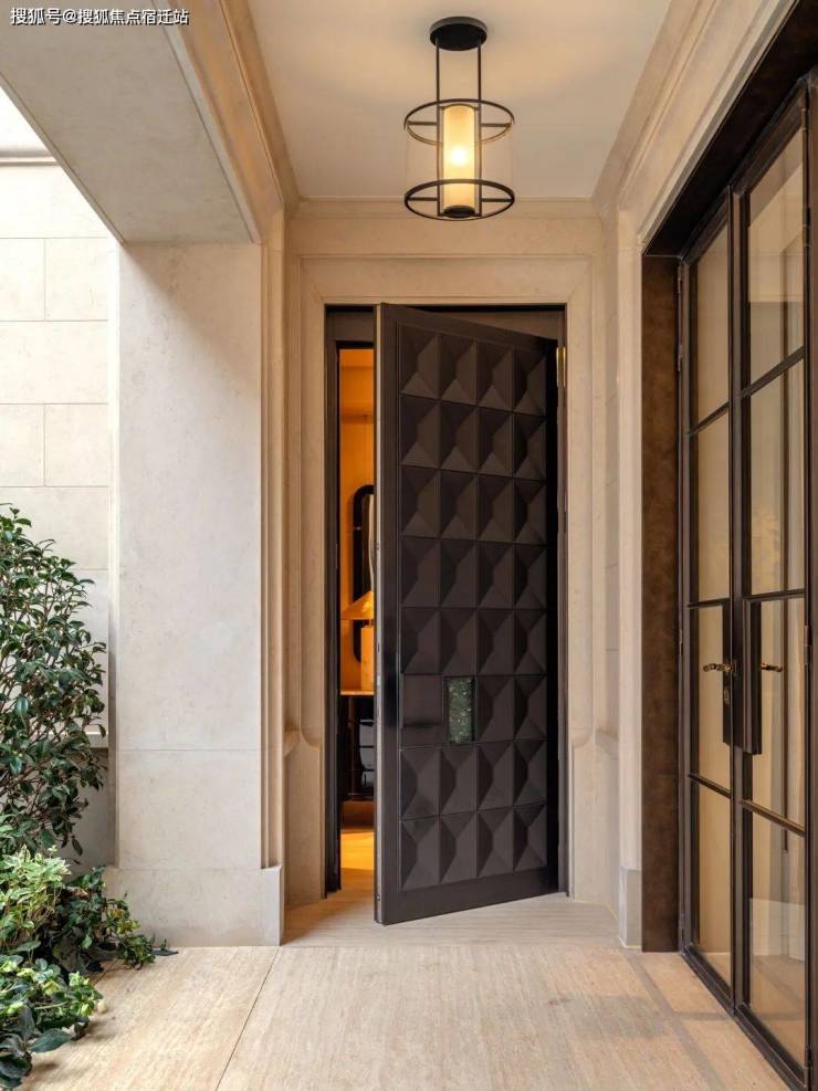 从庭院地面层,可以看到客厅和餐厅的内部空间。客厅在立面上向内凹陷,形成了一条有遮盖的走廊,通向房屋定制的深铜色入户大门。