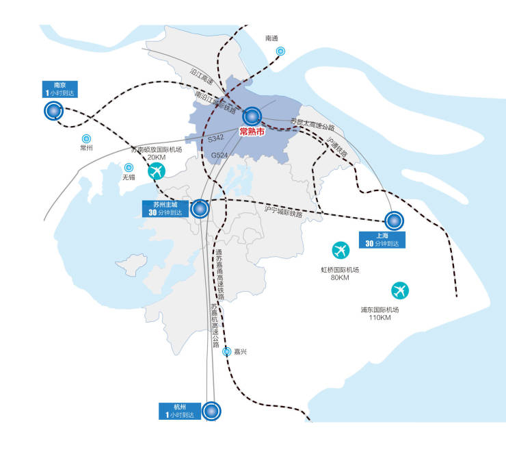 S342省道,30分钟到达硕放机场;G524国道,30分钟到达苏州;30分钟可互通常熟
