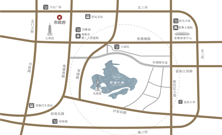 琴湖小镇地处常熟中心,承接新老城区,西眺虞山、尚湖,南邻昆承湖,占据海虞路、新世纪大道两大黄金发展轴,富集醇熟资源。